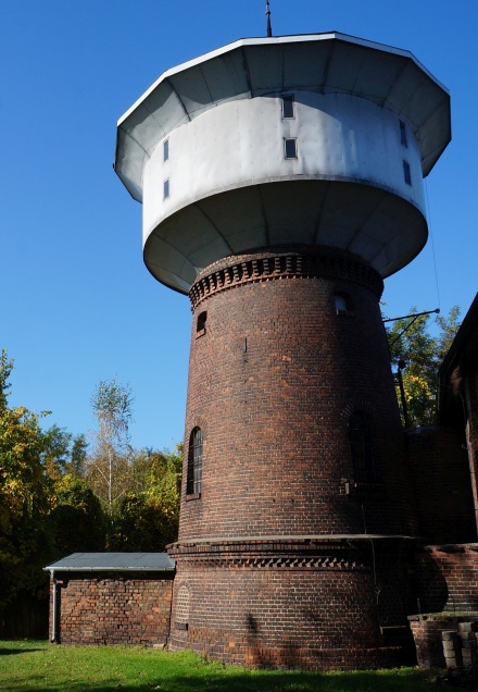Spoglądając przez okna hali można zauważyć górującą nad nią wieżę wodną. Budowano ją w latach 1906-1907, czyli równolegle z pierwszymi czterema stanowiskami szopy. W tym czasie była budowlą wolnostojącą z niezależnym, usytuowanym od północnej strony wejściem.